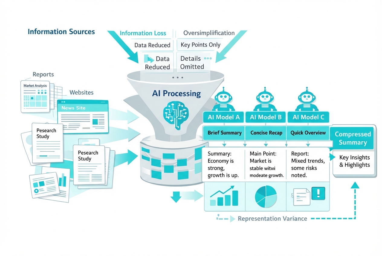 Narrative Compression: AI systems reduce complex organizational stories to essential elements for inclusion in summaries and comparisons. A consulting firm with deep implementation expertise might be characterized simply as "management consulting," losing the execution focus that differentiates it from strategy-focused competitors.